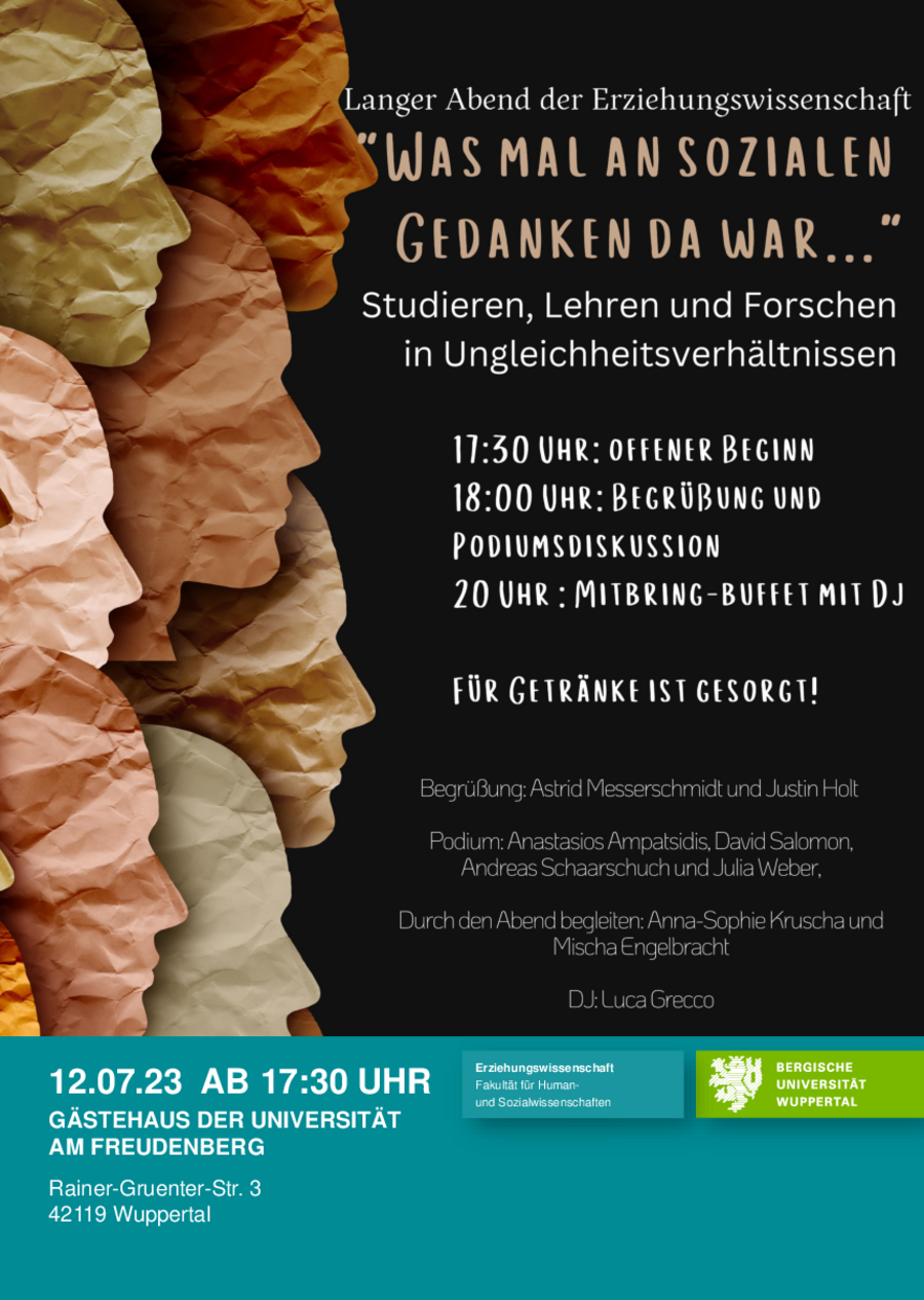 "Was mal an sozialen Gedanken da war..." (Sibylle Berg) - Studieren, Lehren und Forschen in Ungleichheitsverhältnissen, lautet der gedankliche Anstoß für den Abend.