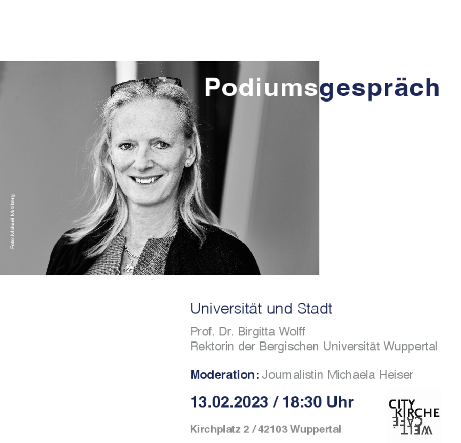 Nutzen Sie diese interessante Gelegenheit, die erste Rektorin der Bergischen Universität Wuppertal persönlich kennenzulernen! Im Podiumsgespräch mit der Journalistin Michaela Heiser wird Prof. Dr. Birgitta Wolff ihr Universitätsprogramm vorstellen und über das Verhältnis von Universität und Stadt diskutieren.