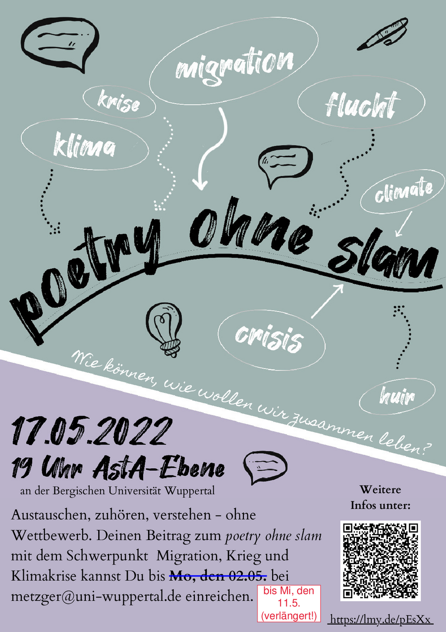 Die AG Migration, Flucht, Rassismuskritik, AStA, InTouch, Students for Future Wuppertal und das netzwerk n organisieren gemeinsam zum ersten Mal im Rahmen der Public Climate School die Veranstaltung poetry ohne slam - ohne slam, weil es uns nicht darum geht, dass sich die Vortragenden messen, wie das bei den üblichen poetry slams der Fall ist. Wir wollen ohne Wettbewerbsdruck Ästhetik und Engagement verbinden und das Erproben unterschiedlichster Ausdrucksweisen ermöglichen. Wir wollen einen gemeinsamen Gedankenaustausch jenseits geregelter und gewohnter Kommunikationsformen des Universitätsalltags anregen.