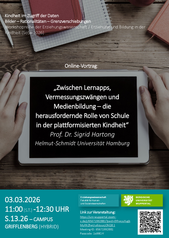 Im Rahmen der Workshopreihe „Kindheit im Zugriff der Daten. Bilder – Rationalitäten – Grenzverschiebungen“ und im Rahmen des Forschungsprojektes DigiFo wird die Soziologin und Erziehungswissenschaftlerin Prof. Dr. Sigrid Hartong am Dienstag, den 03. März 2026, von 11:00–12:30 Uhr einen Online-Vortrag mit dem Titel "Zwischen Lernapps, Vermessungszwängen und Medienbildung – die herausfordernde Rolle von Schule in der plattformisierten Kindheit" halten.