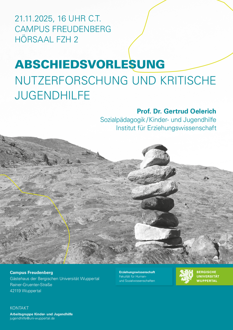 Die Arbeitseinheit Sozialpädagogik/Kinder- und Jugendhilfe lädt ein zur öffentlichen Abschiedsvorlesung von Prof. Dr. Gertrud Oelerich (Professur für Sozialpädagogik/Kinder- und Jugendhilfe sowie Prorektorin für Nachhaltigkeit Organisationsentwicklung und Diversität) am 21.11.2025 um 16.00 Uhr (c.t.) im Hörsaal FZH 2 am Campus Freudenberg der Bergischen Universität Wuppertal.