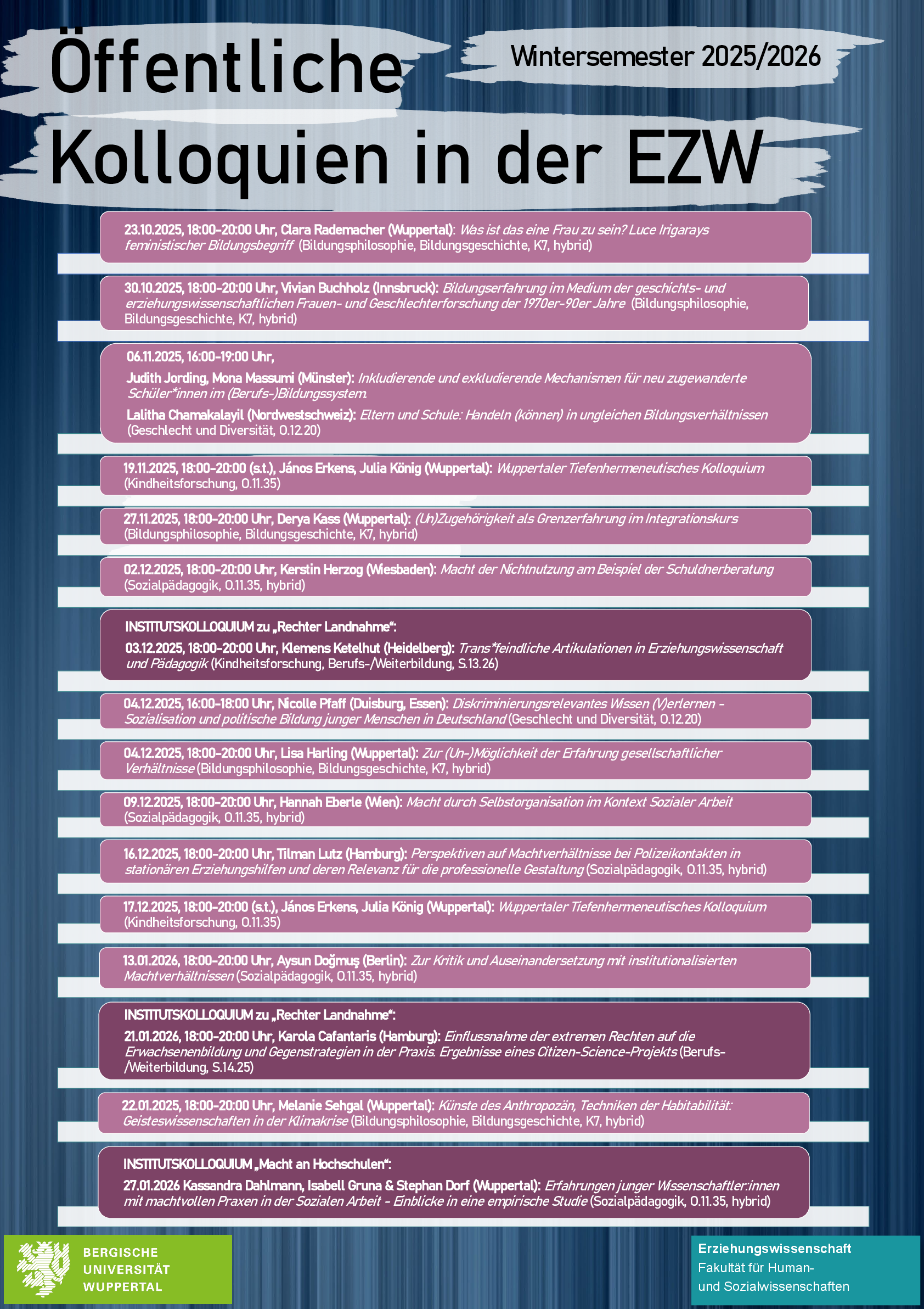 Unter der Leitung von Janos Erkens und Julia König findet an drei Terminen im Wintersemester 2025/26 ein tiefenhermaneutisches Kolloquium statt. Dieses bietet die Möglichkeit tiefenhermeneutisches Arbeiten forschungspraktisch auszuprobieren und erste Eindrücke von der methodischen Vorgehensweise zu sammeln. In der Forschungswerkstatt wird nach einer Auftakt-Sitzung mit empirischem Material der Teilnehmenden tiefenhermeneutisch gearbeitet. Vorerfahrungen der Teilnehmenden sind hierbei nicht erforderlich.
